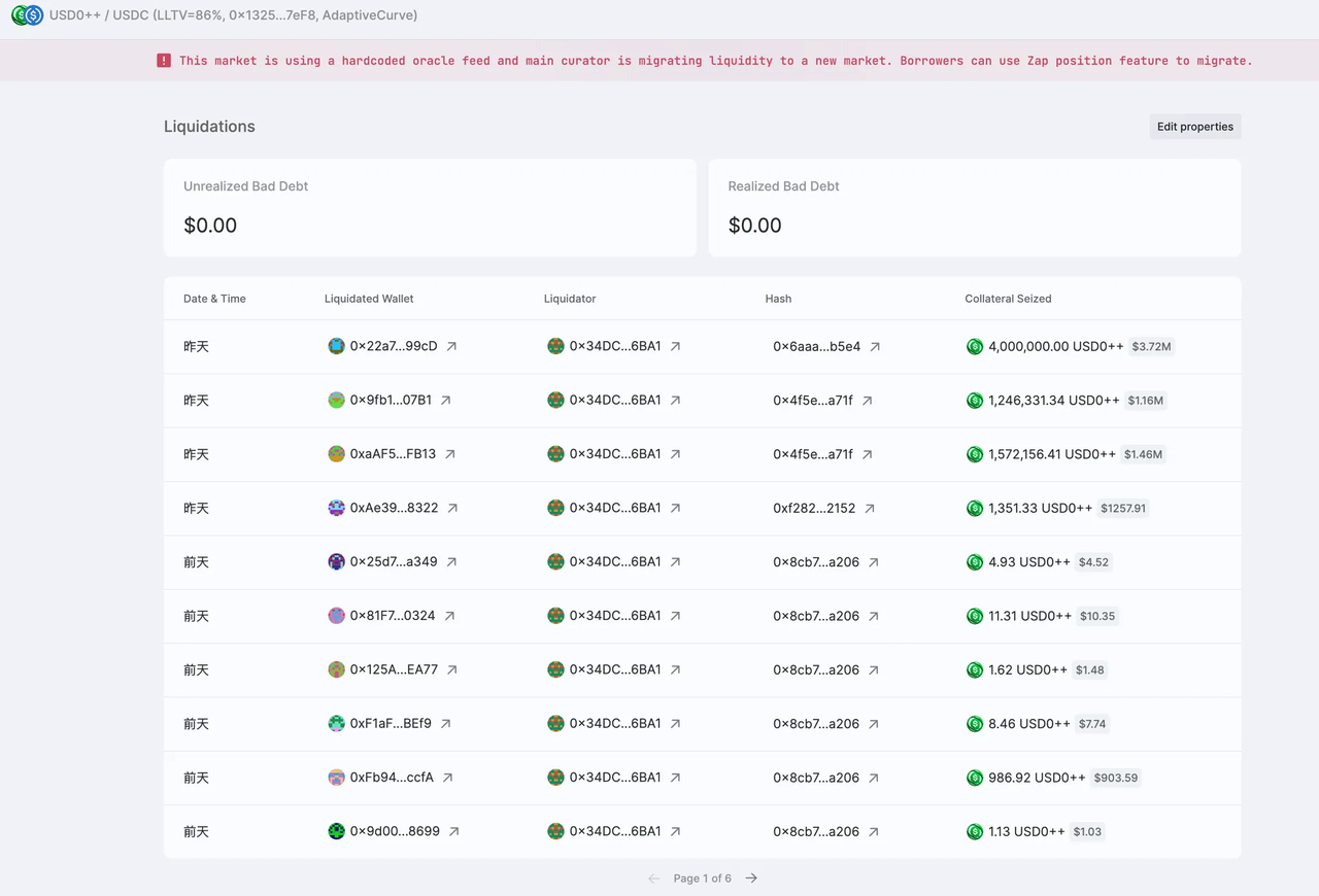 USD0++ 币价下跌,Morpho USD0++ / USDC 市场流动性撤出甚至出现坏账,整个晋西北乱成了一锅粥。这时候 Usual 项目方下场了,建立新市场,清算旧坏账。