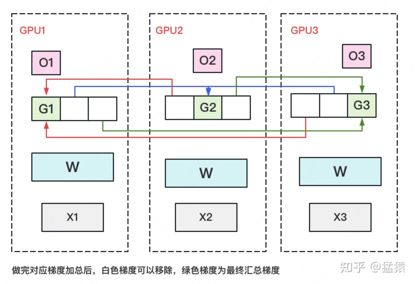 对于不同的GPU就会存储不同的梯度(g1, g2, g3白色的就会剔除掉)前向和反向传播需要通过 All-Gather 和 All-Reduce 操作同步梯度和参数