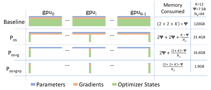 - 3、理论上分析,在显存占用上是 \(P_{OS}<P_{OS+g}<P_{OS+g+p}\) 但是实验过程中会出现相反的情况,参考这部分讨论:1、在使用