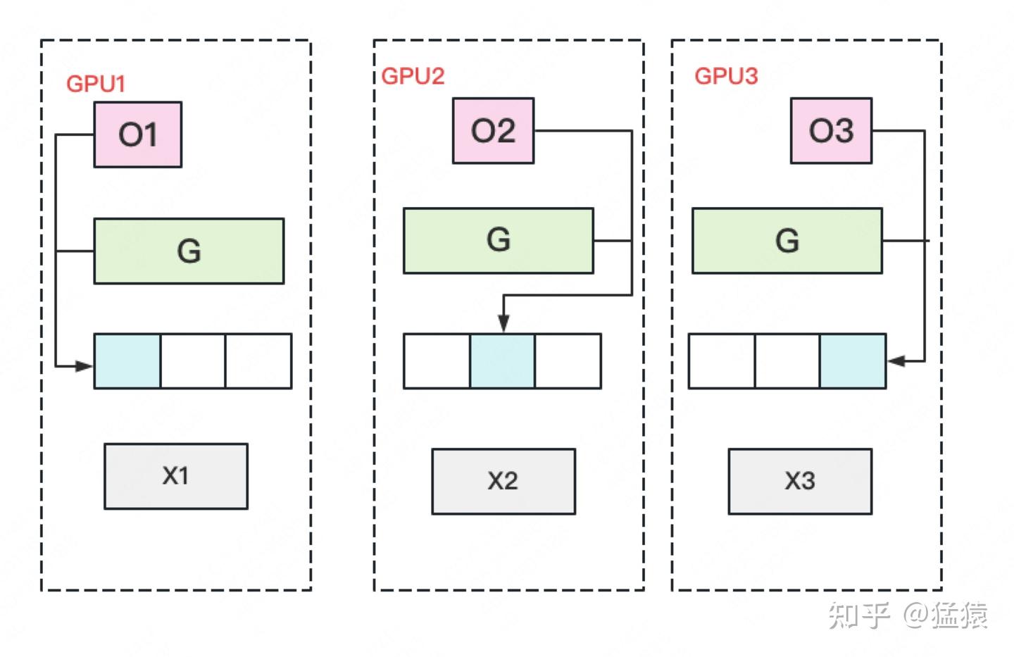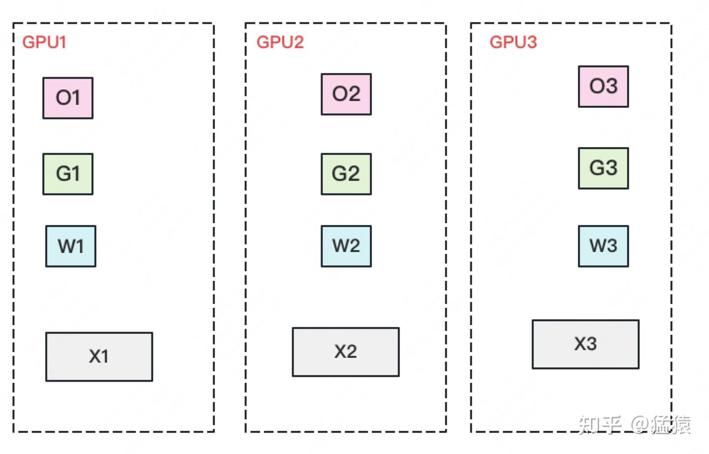 因为会将优化器状态切分,那么在3个不同设备上分别存储3分优化器状态(o1, o2, o3),对于这3部分优化器(因为优化器最后还是去“作用”到梯度上),分别对各自的梯度进行优化,但是会有一个问题:每块GPU上存储的是 一部分优化器状态,那么对于每份优化器也只能去优化各自的参数,每次更新需要通过 All-Gather 操作合并梯度,完成优化器状态更新