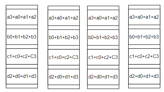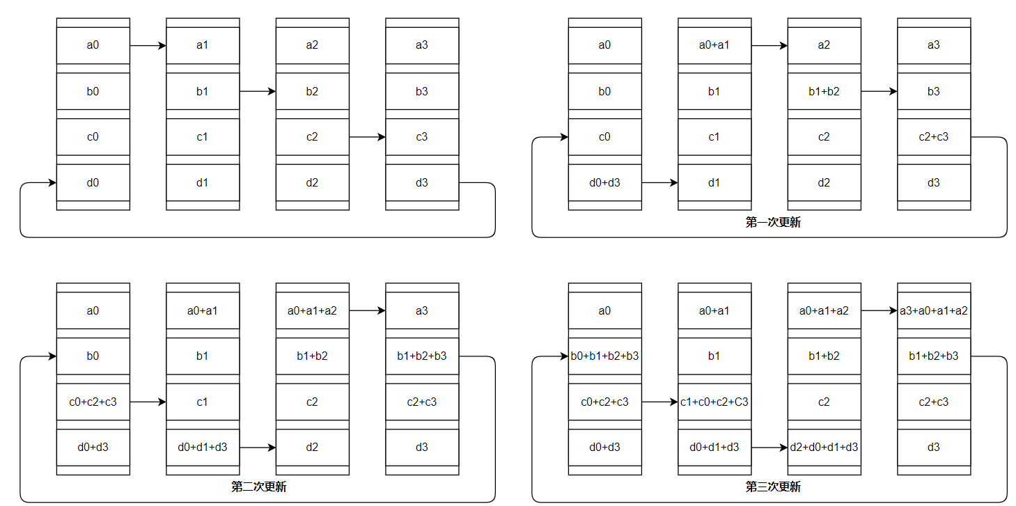 通过3次参数更新之后,这样就会出现不同设备上都会有一个都具有参数\(a_i+ b_i+ c_i+ d_i\)那么下一阶段就是通过