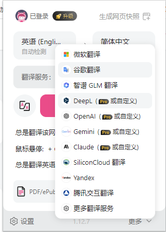 但是用微软翻译、谷歌翻译、智谱 GLM 翻译等的这些不带“Pro”标识的,就是免费的。