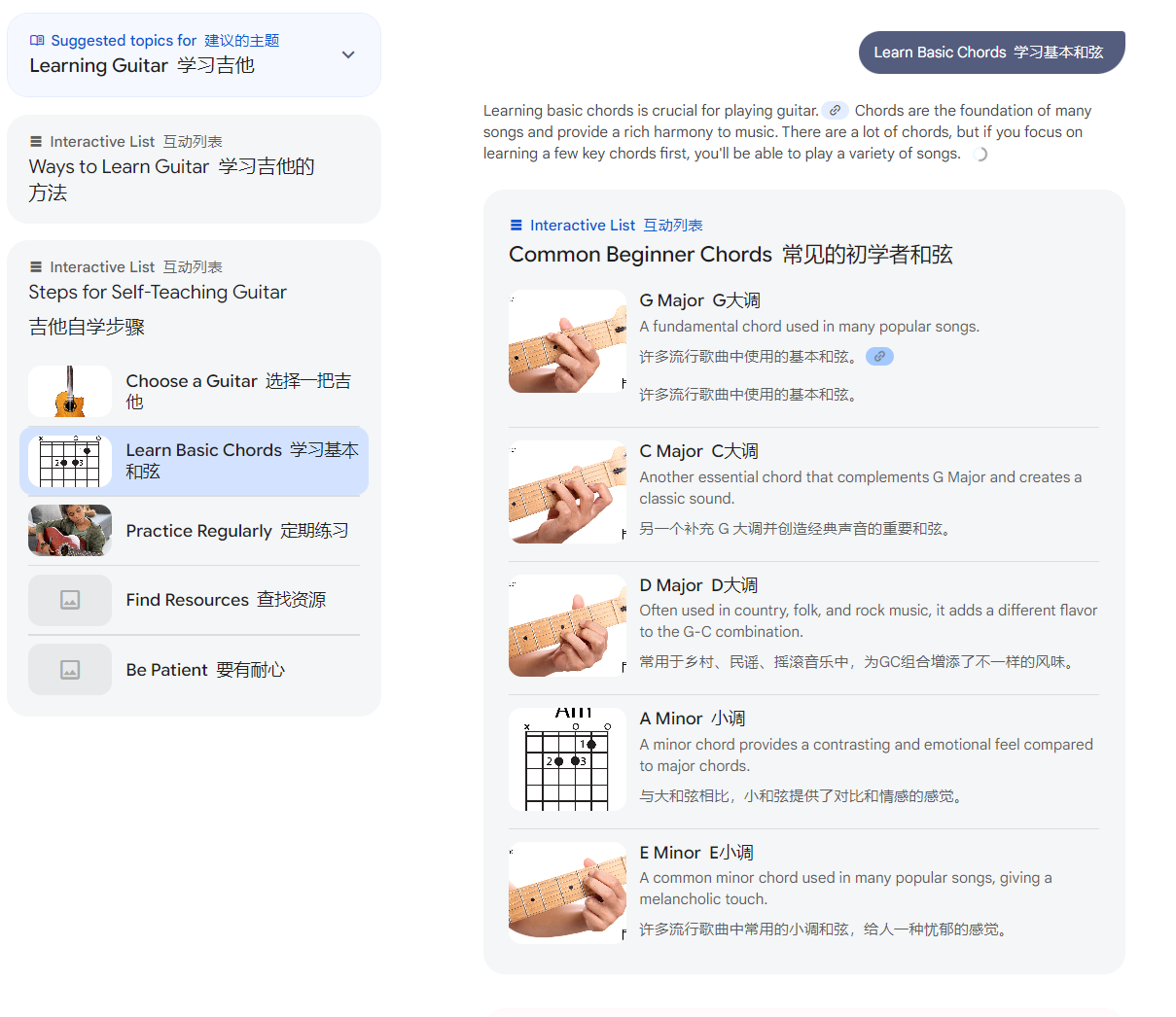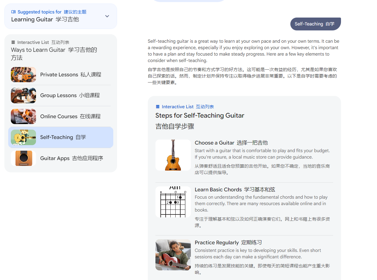 然后再次出现一个“互动列表”,从选吉他开始,到学习基本和弦,再到慢慢练习: