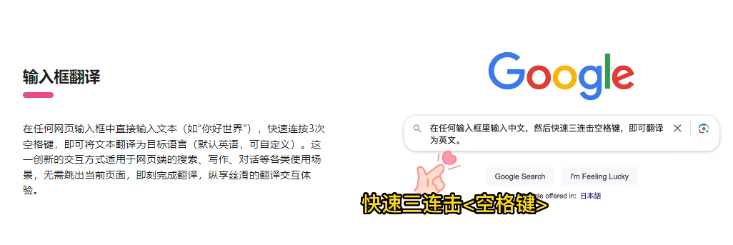 “沉浸式插件”支持你在输入中文之后,快速点击三次空格键,直接把中文翻译成英文。
