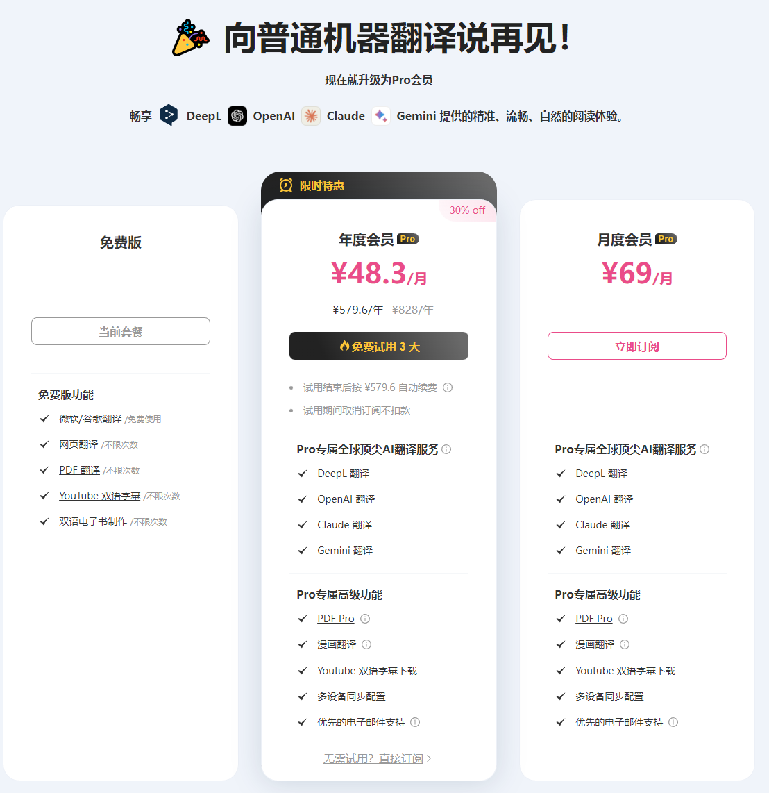 付费版的话,大概 50 元一个月,对于经常需要浏览外文资料的朋友应该还是有帮助: