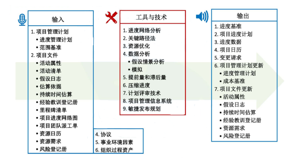 - 资源日历:更新资源日历,以反映因资源优化、进度压缩,以及纠正或预防措施而导致的资源日历变更