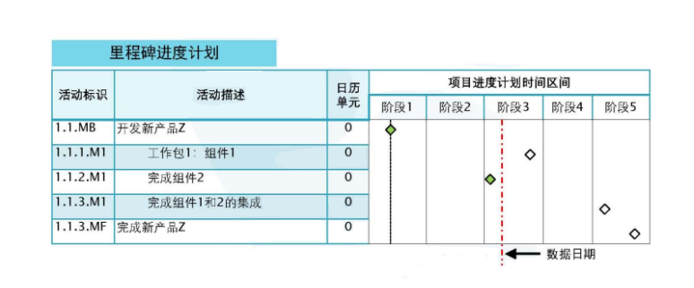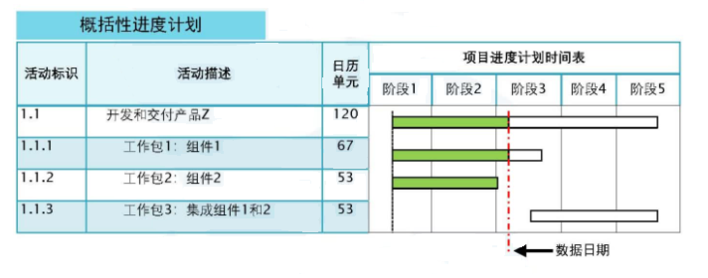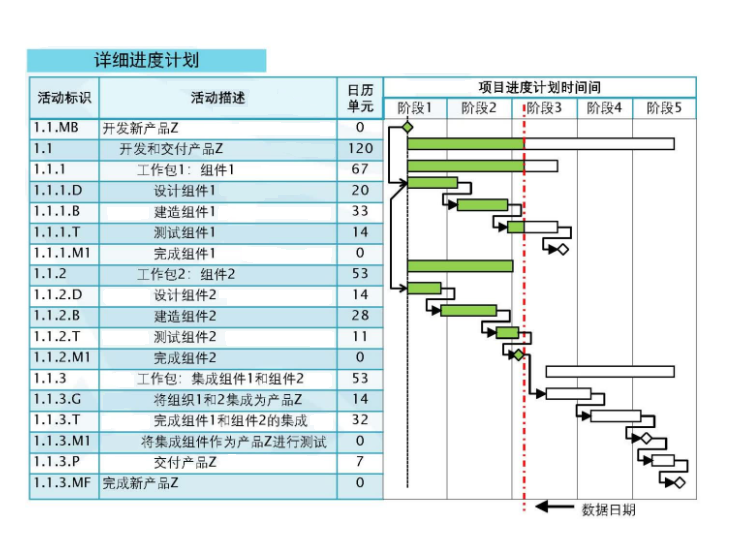 - 项目进度计划:其中图示了截至指定日期的更新情况、已完活动和已开始活动