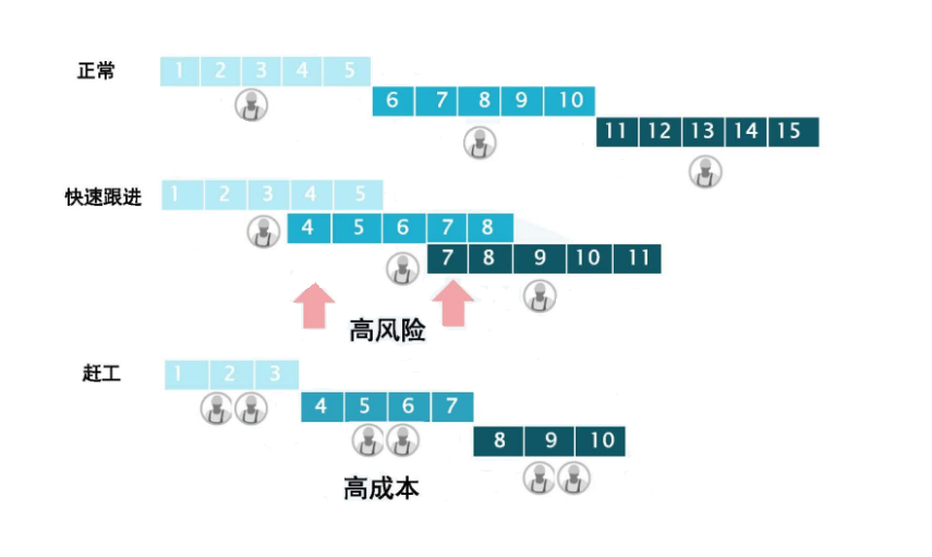 进度压缩:采用进度压缩技术使进度落后的项目活动赶上计划,可以对剩余工作使用快速跟进或赶工方法