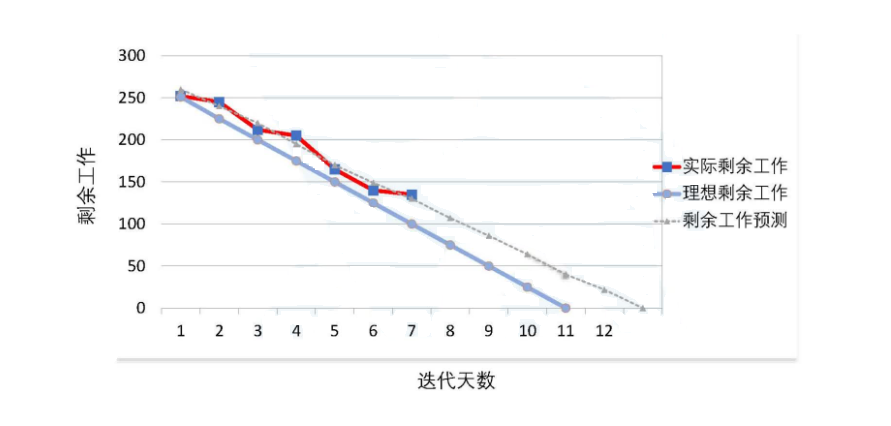 - 图解: 横轴就是时间,y轴是指剩余的工作量(剩余的工作:如果用敏捷一般叫故事点或功能点,项目里250个故事点是此次预计迭代完成工作量,第一天结束完成了蓝色的线,是理想的剩余工作,就是按照计划整11天结束之后,整个项目所迭代要做的工作全完成了,工作量是0了,但是实际看红色的线,实际第一天结束之后,没有达成第一天的预期的要求,没完成那些工作,所以剩的东西很多,比如应该每天完成225个故事点,结果只完成5个,第一天结束还剩245个位置,第二天结束,总是比预期的高.)
