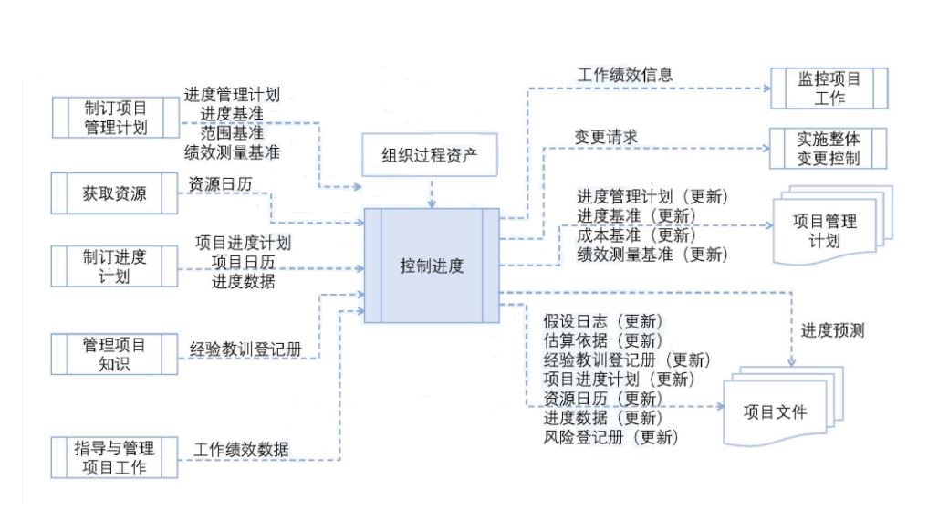 - 监督项目状态,以更新项目进度和管理进度基准变更.(不仅要关注状态的情况,出现变更的时候,要走整体变更控制流程去维护基准.)