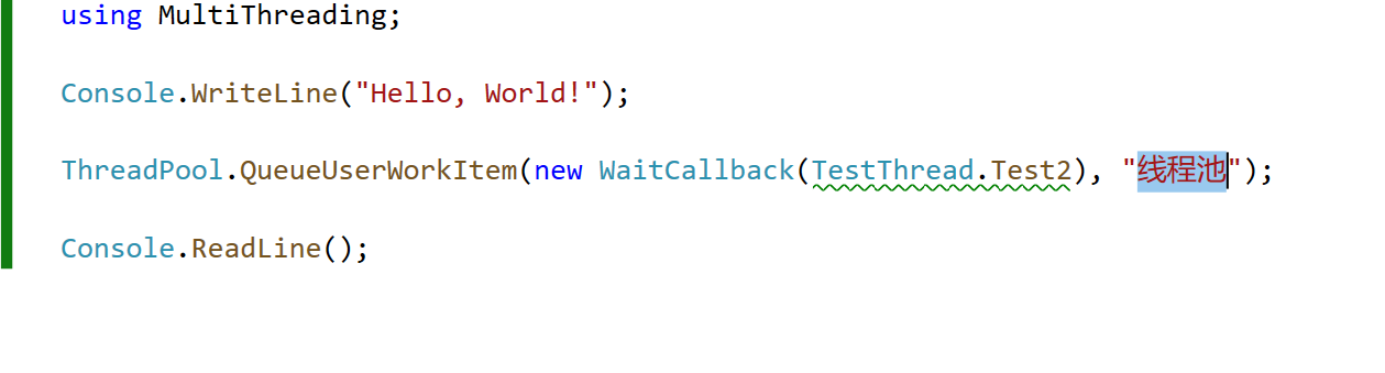 2、WaitCallback也是一个委托,传入需要在线程池内执行的方法名称。以下代码内,“线程池”字符串为要执行方法对应的参数