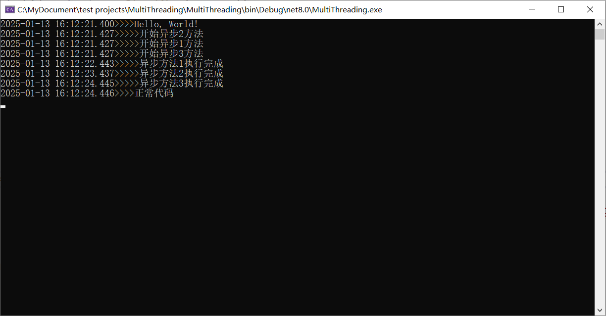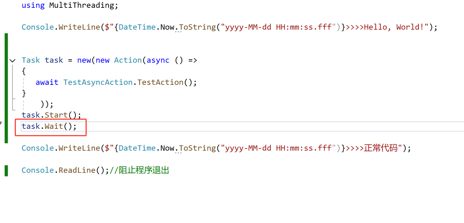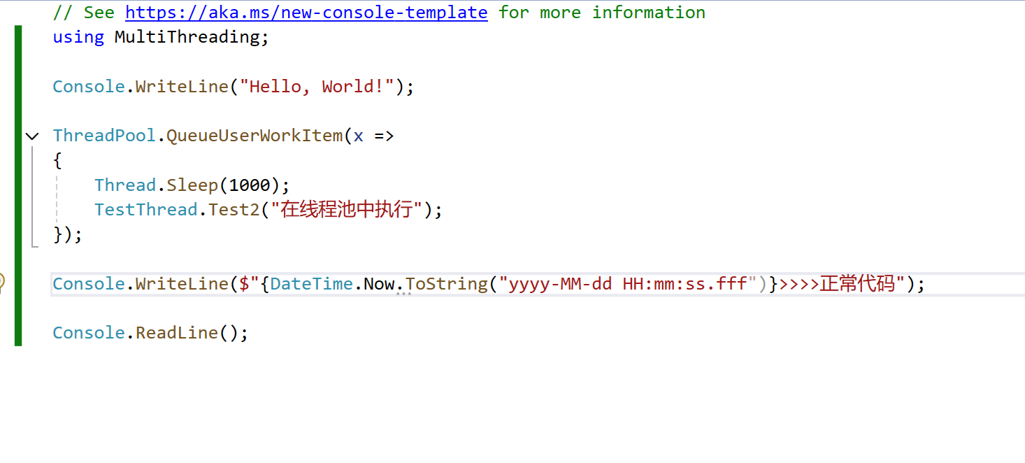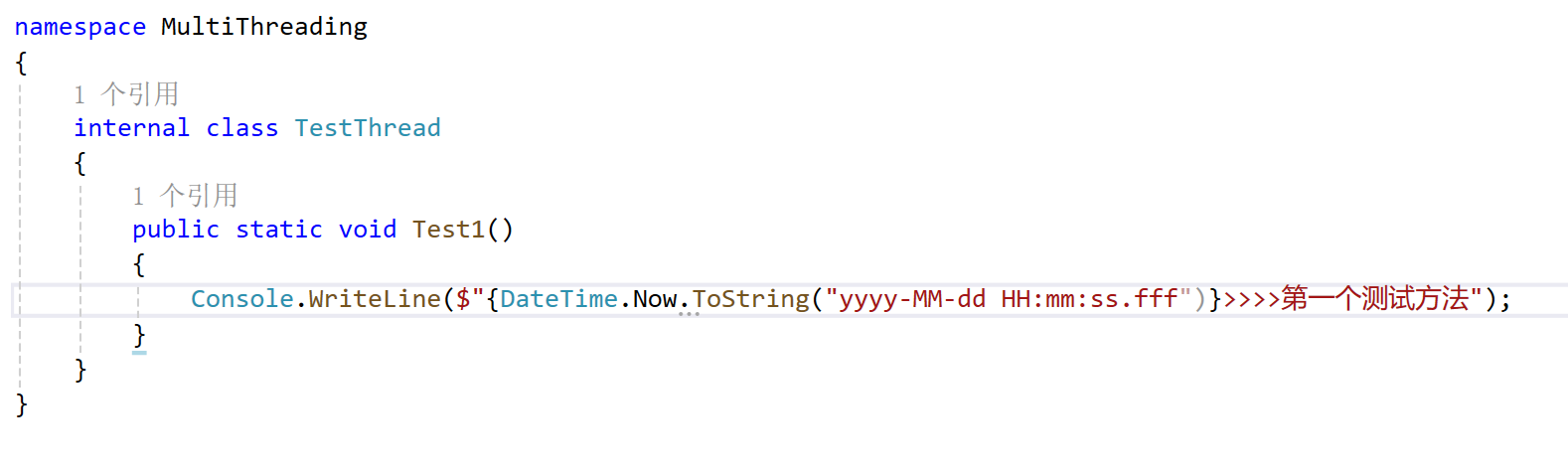 Console.WriteLine($"{DateTime.Now.ToString("yyyy-MM-dd HH:mm:ss.fff")}>>>>正常代码");