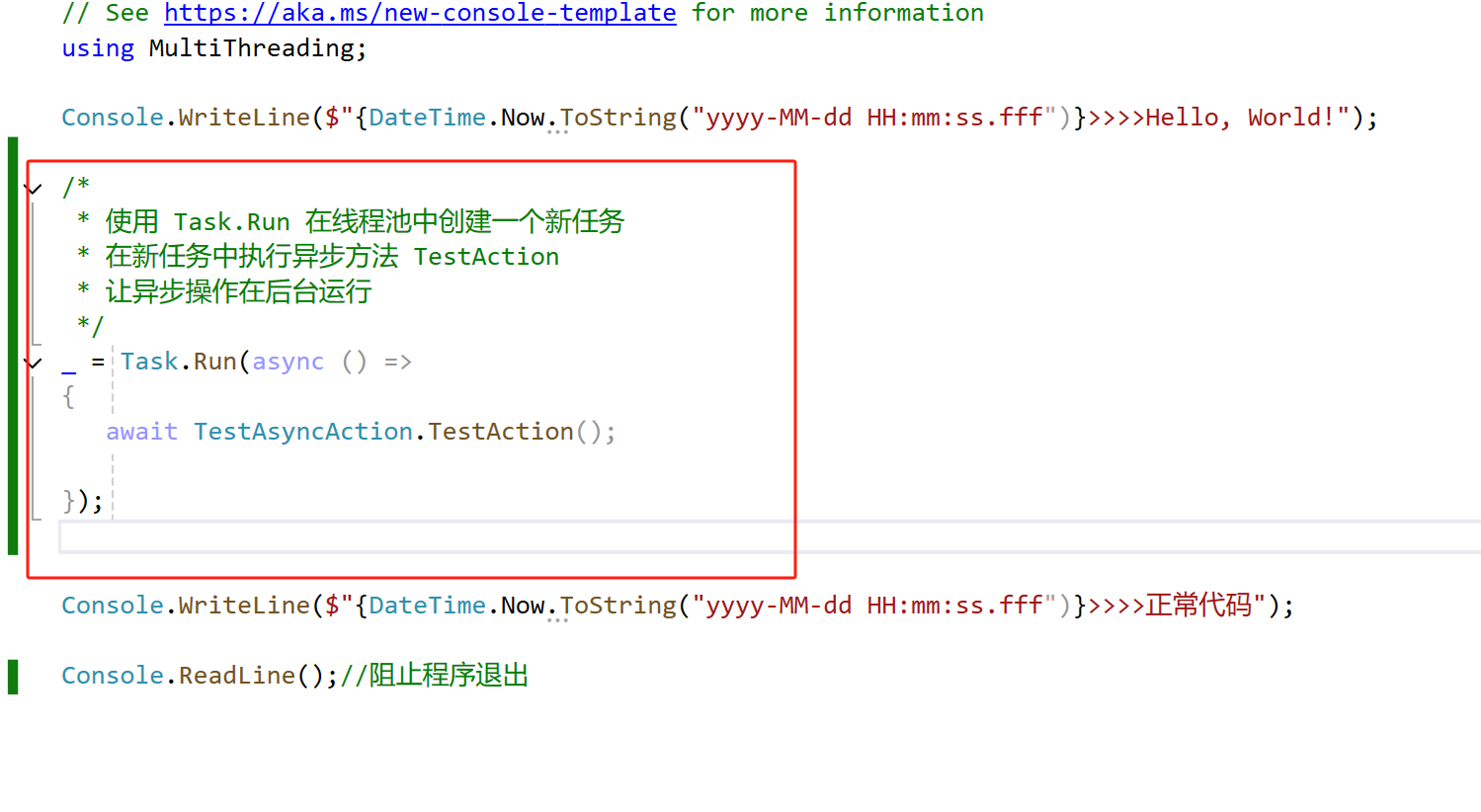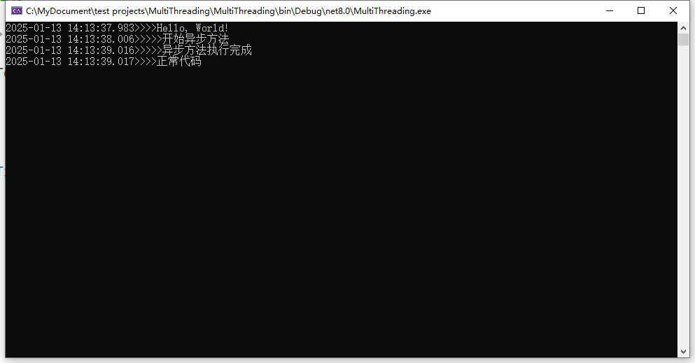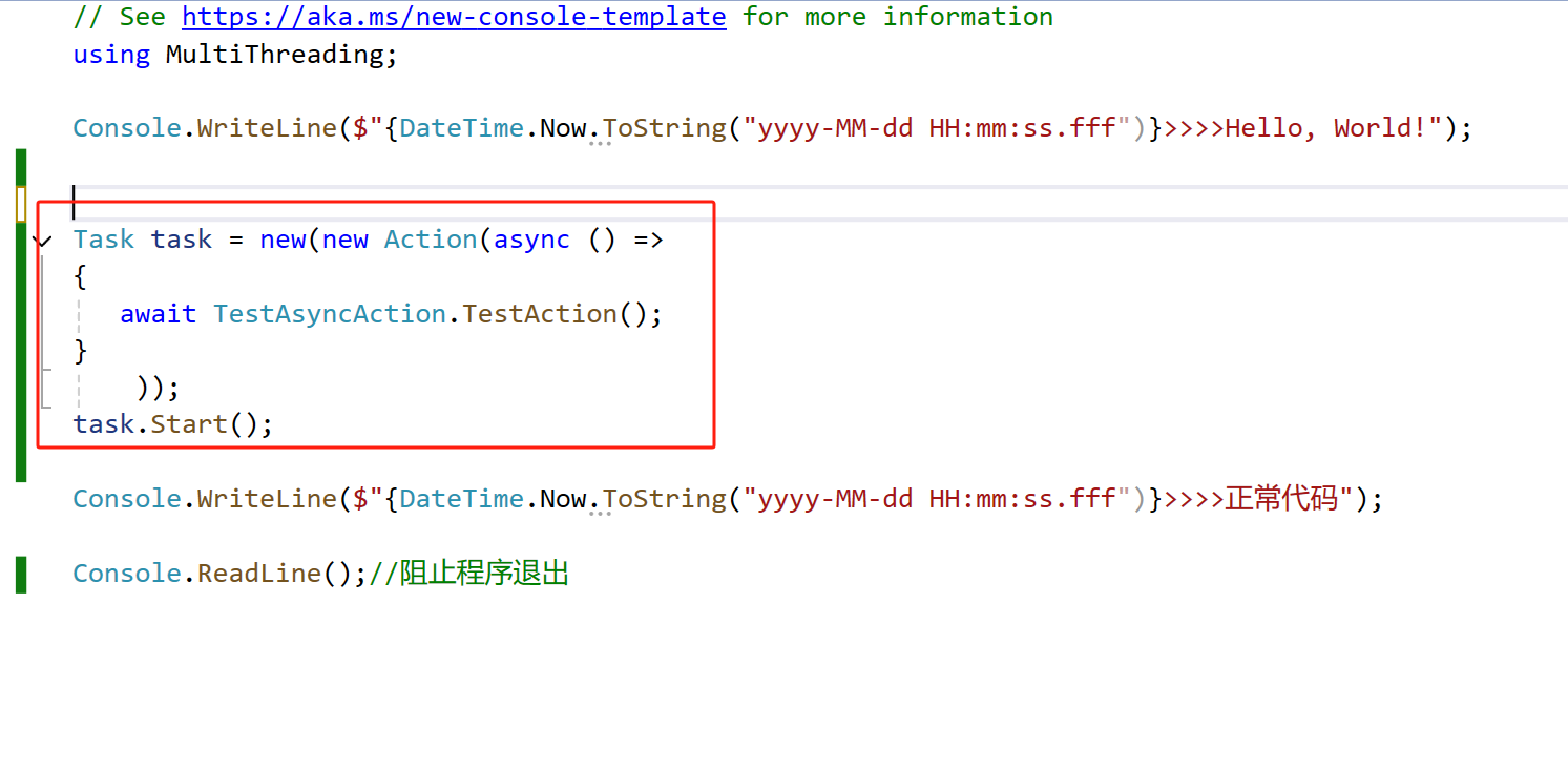 Console.WriteLine($"{DateTime.Now.ToString("yyyy-MM-dd HH:mm:ss.fff")}>>>>正常代码");
