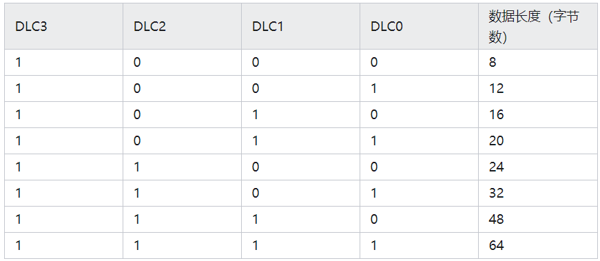 DLC(Data Length Code):数据长度编码,共有4位,用来表示数据的实际长度(字节)。DLC0是DLC的第0位,DLC3是其第3位。四位二进制数最大可以表示的数值为15。因此,对于经典CAN数据长度最大8字节来说,数据长度编码可以顺序编号,如下面的表格所示.