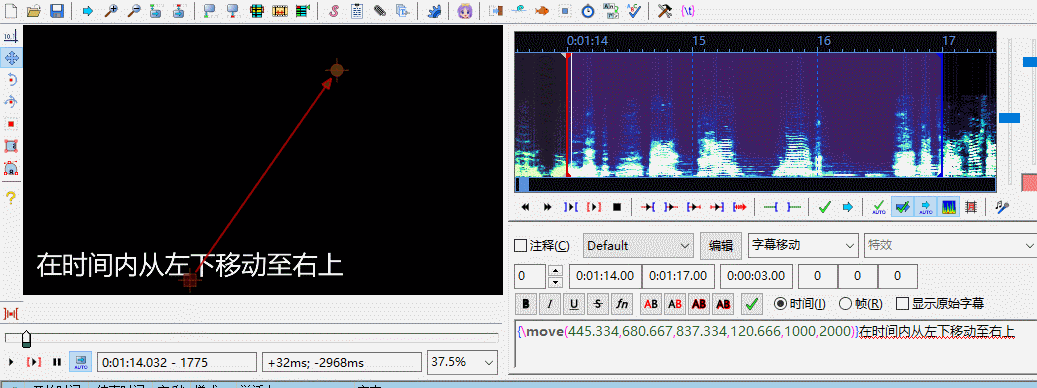 - 参数示例:\move(445.334,680.667,837.334,120.666,1000,2000) 在1000ms前字幕停留在坐标445.334,680.667位置,1000ms-2000ms期间从坐标445.334,680.667移动至坐标837.334,120.666,在2000ms后停留在坐标837.334,120.666直至该条字幕结束。