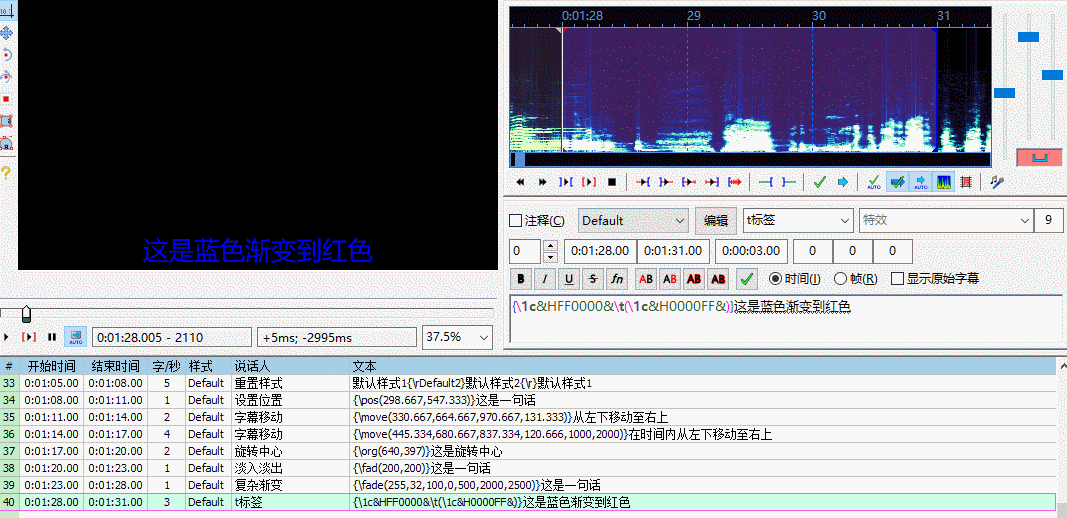 参数示例: \1c&HFF0000&\t(\1c&H0000FF&)