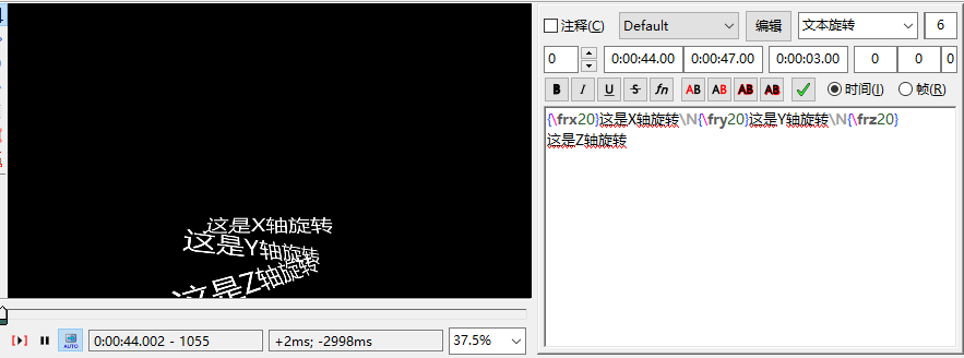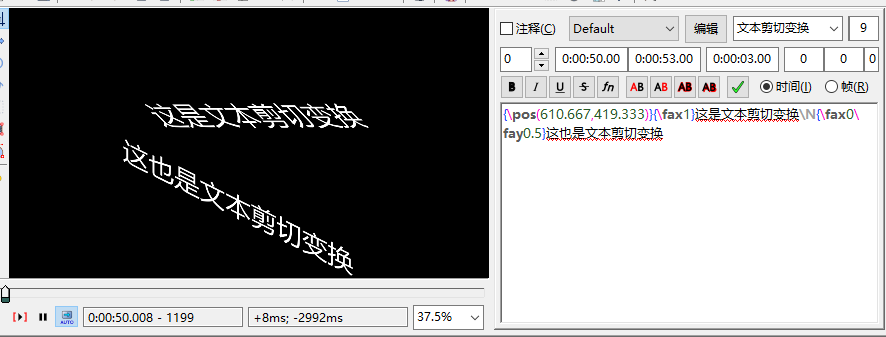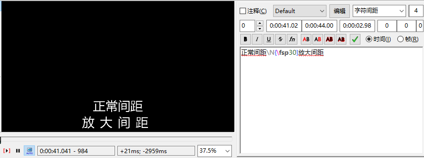 - 应注意两个参数不能超过字幕的持续时间。若当前行持续时间为3s,则<淡入参数时间>+<淡出参数时间>应≤3000。