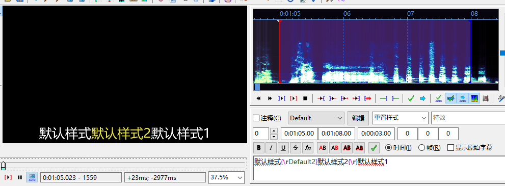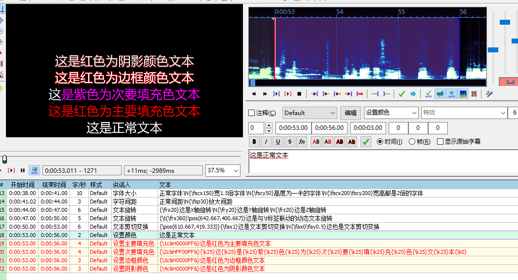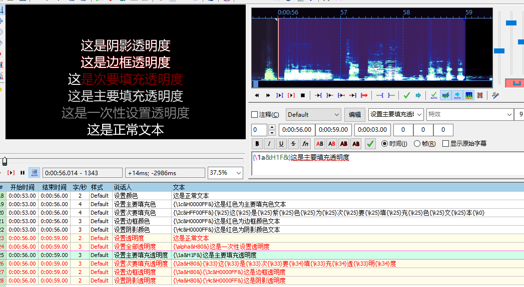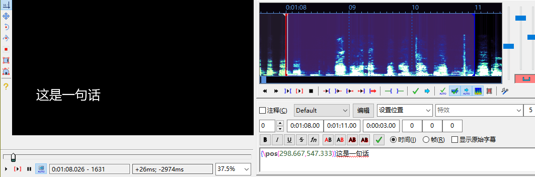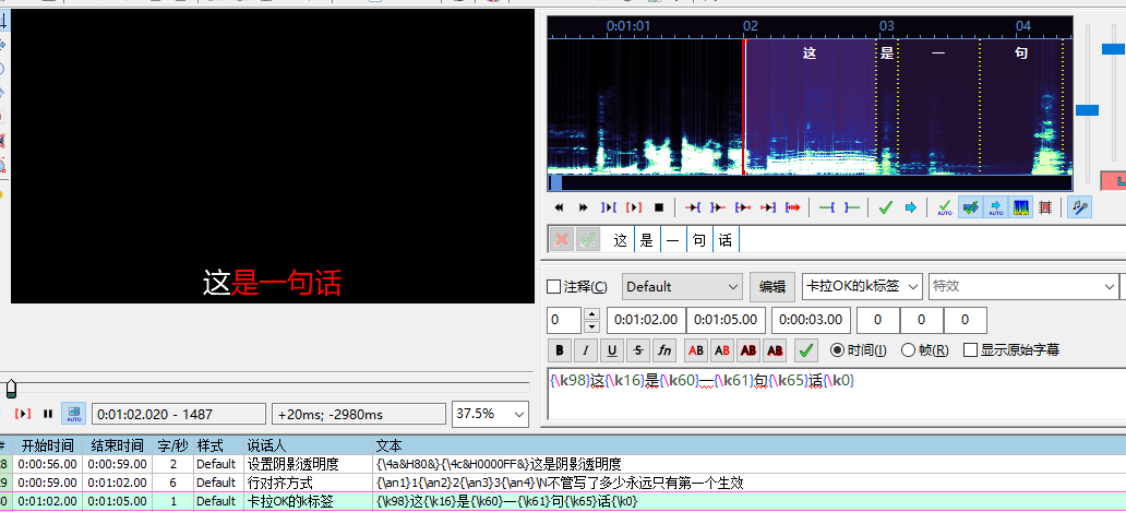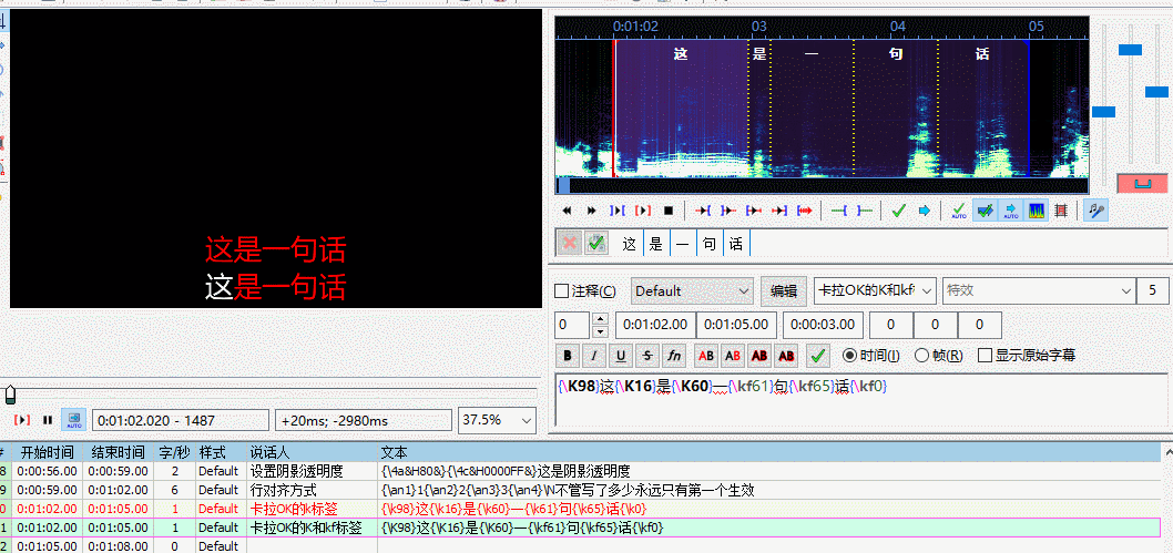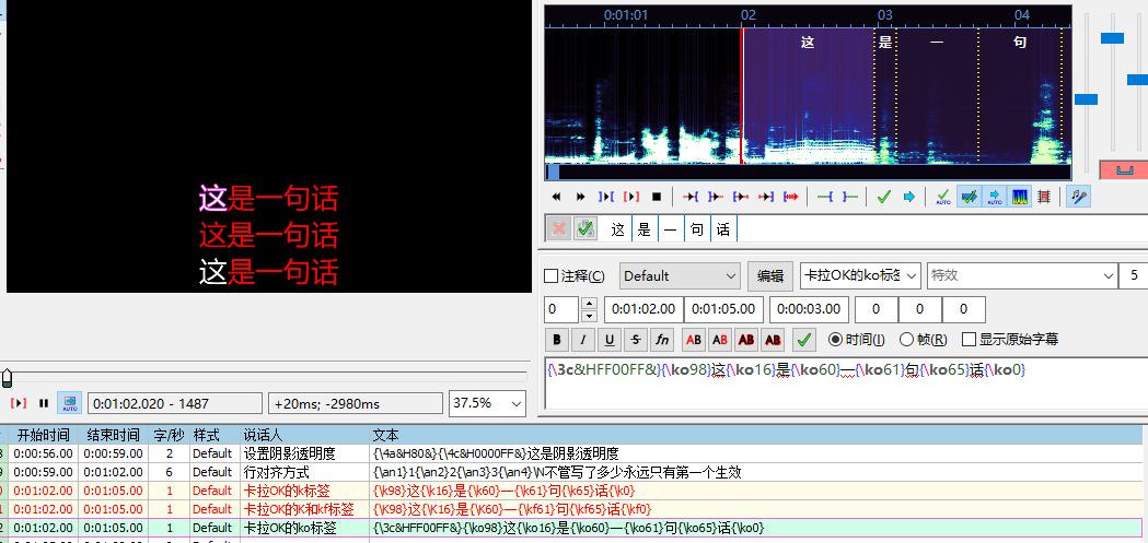 - \k标签使用Aegisub的卡拉OK模式添加,在卡拉OK模式中标记出字幕每个音节的持续时间。