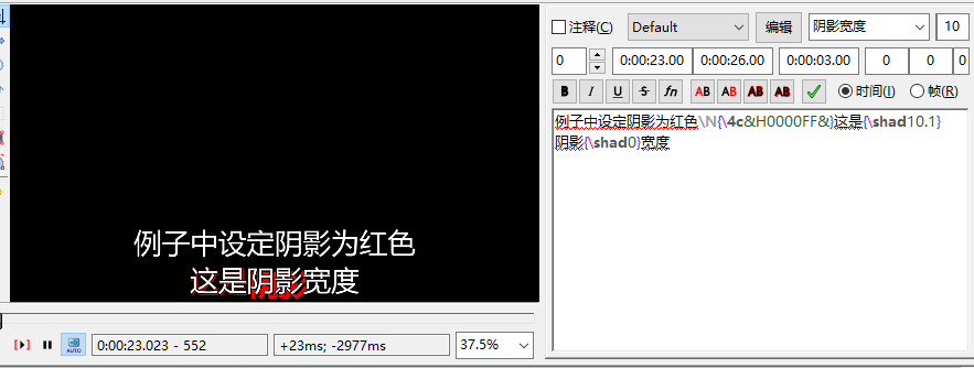 - 例子中{\4c&H0000FF&}为设定阴影为红色。