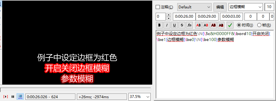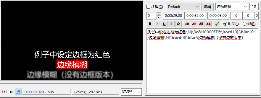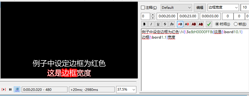 - 例子中{\3c&H0000FF&}为设定边框为红色。
