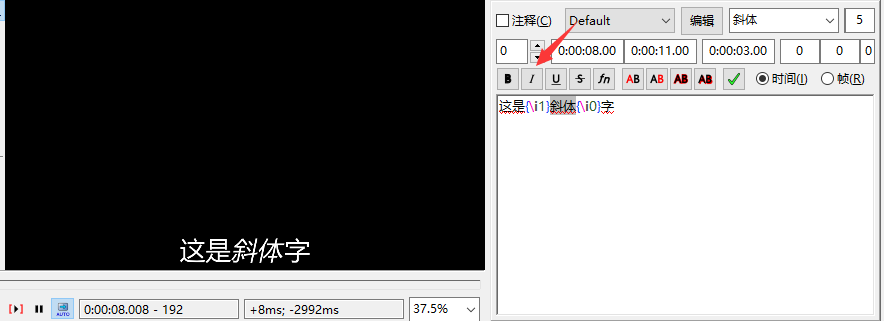- 打开\i1或关闭\i0 斜体。在字幕编辑栏选择斜体按钮也可以使用。