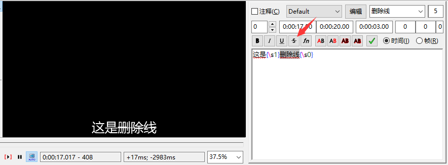 - 打开\s1或关闭\s0 删除线。在字幕编辑栏选择斜体按钮也可以使用。