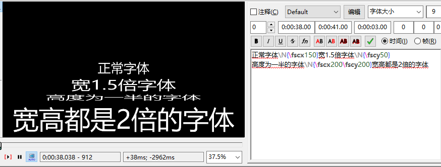 - 参数解析: \fscx150宽度是正常字符的1.5倍;\fscy50高度是正常字符的一半;\fscx200\fscy200宽高都是正常字符的2倍。