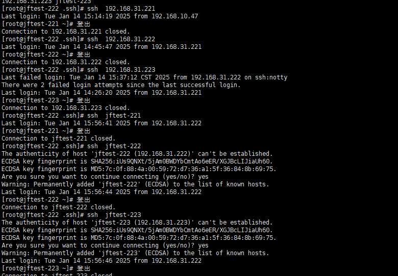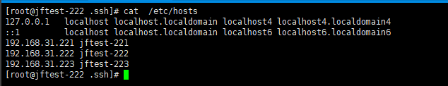 [root@jftest-222 .ssh]# sed -i ‘$a\192.168.31.221 jftest-221\n192.168.31.222 jftest-222\n192.168.31.223 jftest-223’ /etc/hosts