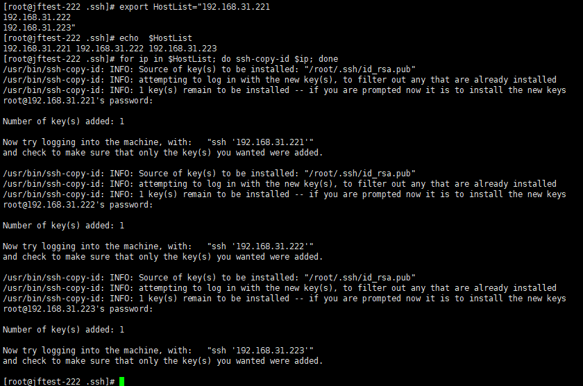 [root@jftest-222 .ssh]# for ip in $HostList; do ssh-copy-id $ip; done