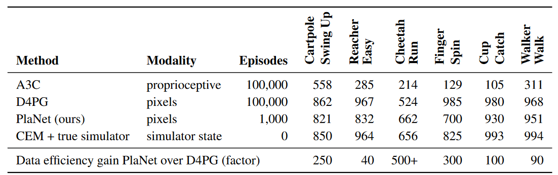 - PlaNet (CEM + 世界模型) 和 CEM + true simulator对比只差了一些,体现出世界模型较好地学习到了环境。