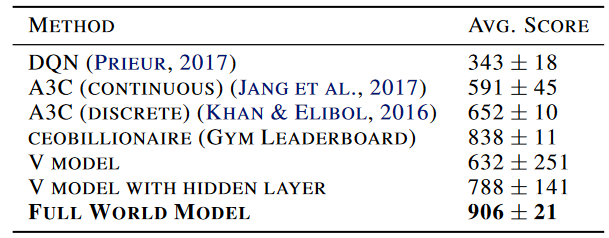 在Car Racing中,消融实验显示,单独的视觉模块效果不如一整个的世界模型 (但是也已经超过了DQN和A3C)