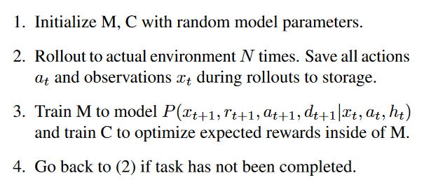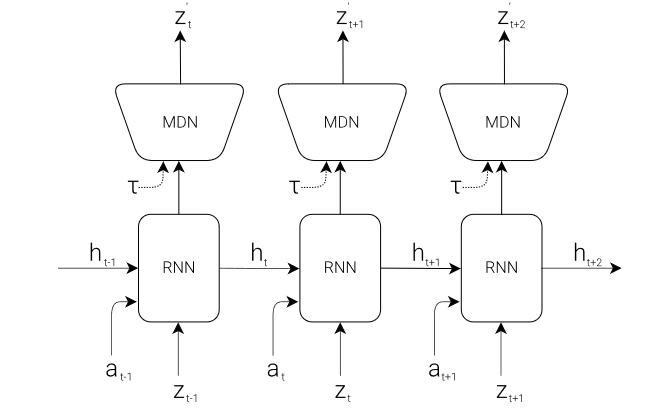 - 在图中,MDN-RNN建模的是\(P(z_{t+1}\mid a_t, z_t, h_t)\).