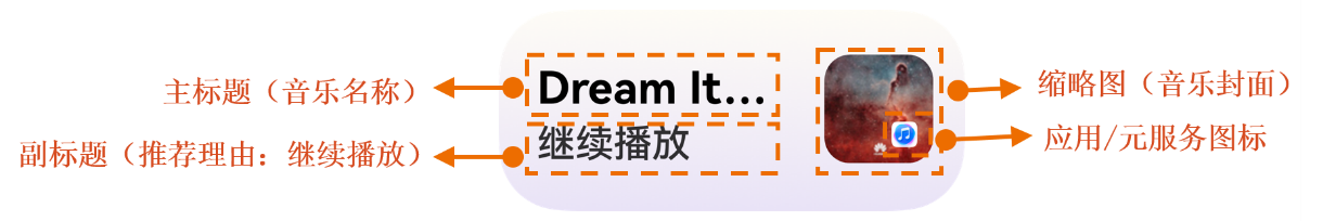 意图框架提供各垂域习惯推荐在小艺建议中展示使用的标准模板卡片,开发者无需开发展示卡片。在展示模板上,会展示应用/元服务名称与logo和内容必要信息,比如音乐名、音乐图片,这类参数需要开发者共享到系统。