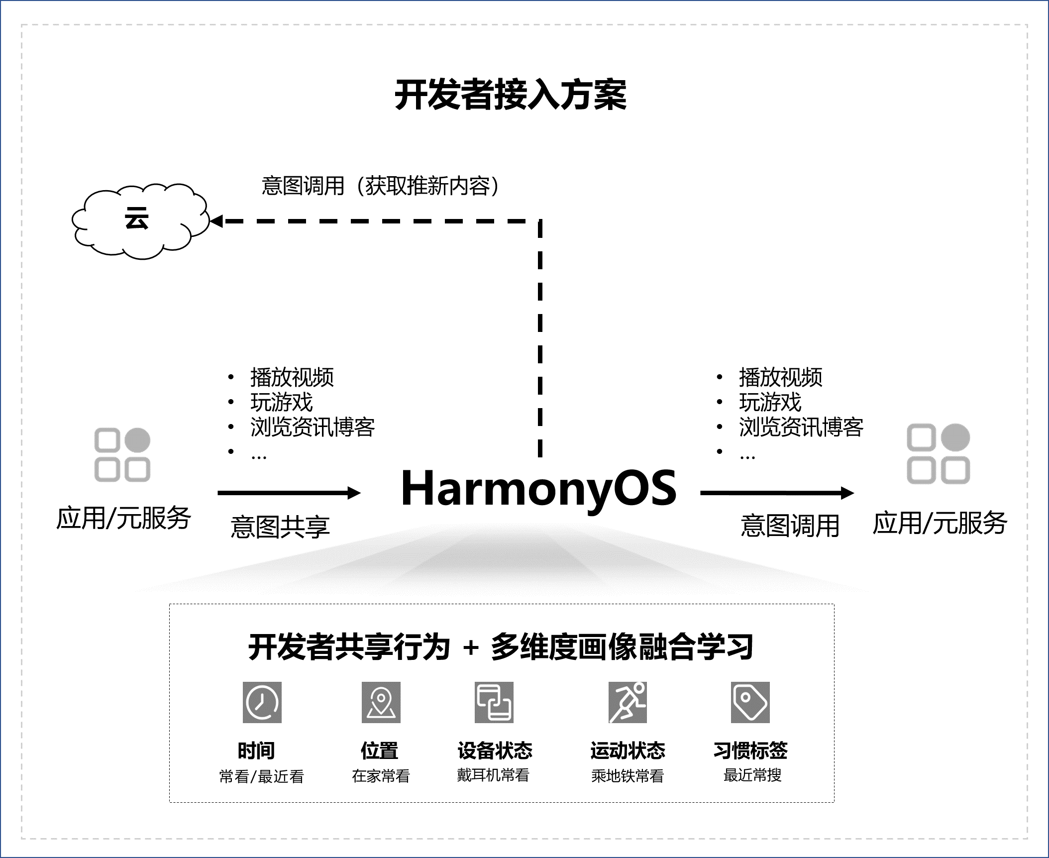 基于此,HarmonyOS SDK意图框架服务(Intents Kit)提供习惯推荐方案,是HarmonyOS学习用户的行为习惯后做出的主动预测推荐。开发者将用户在应用/元服务内的使用行为向HarmonyOS共享,使得HarmonyOS可以基于共享的数据学习用户的行为习惯。在HarmonyOS学习到用户的行为习惯后,会给用户推荐相应功能,并且尝试补充详细功能参数,减少用户执行任务的步骤。