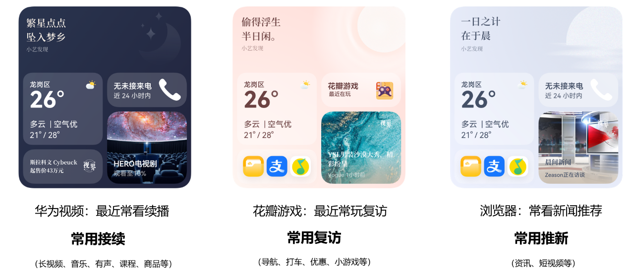 当前习惯推荐可在小艺建议入口分发,在不同垂域中,填充功能详细参数或内容的逻辑不同,主要典型场景可分为常用接续、常用复访、常用推新三类。以常看视频续播为例,系统预测当前用户使用华为视频的播放视频功能概率较高,会选择用户最近观看且还没看完的视频内容来补充功能细节,在小艺建议中以模板卡形式推荐展示,用户点击卡片后,实现一步跳转进应用的视频播放页。
