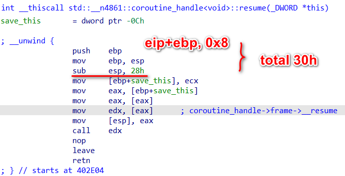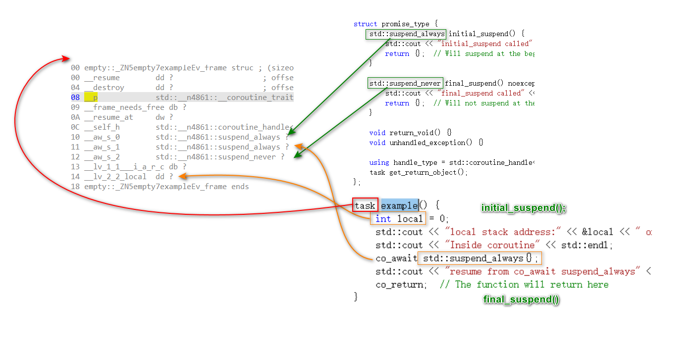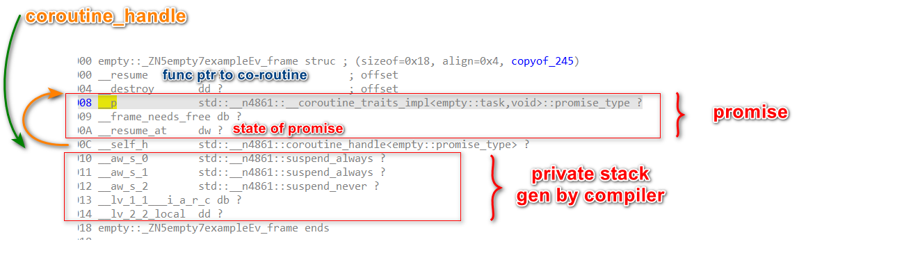 先来看编译器将c++代码的协程函数做了什么处理,产生了哪些实际的代码。
