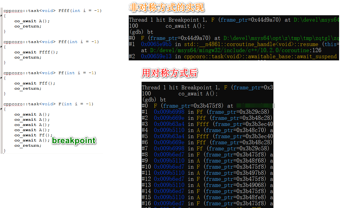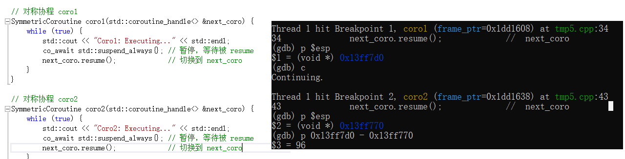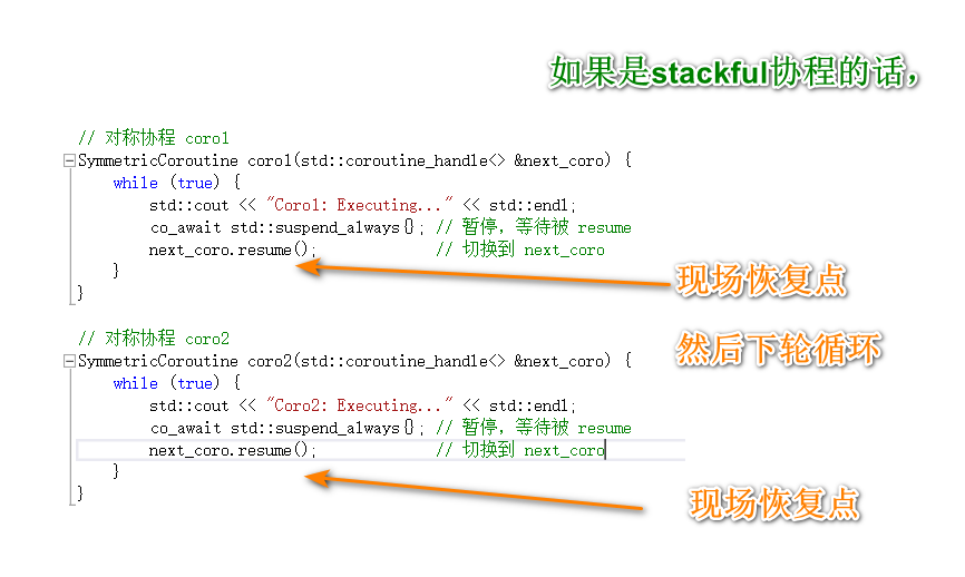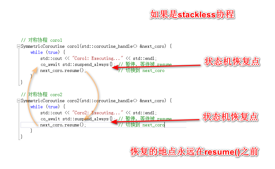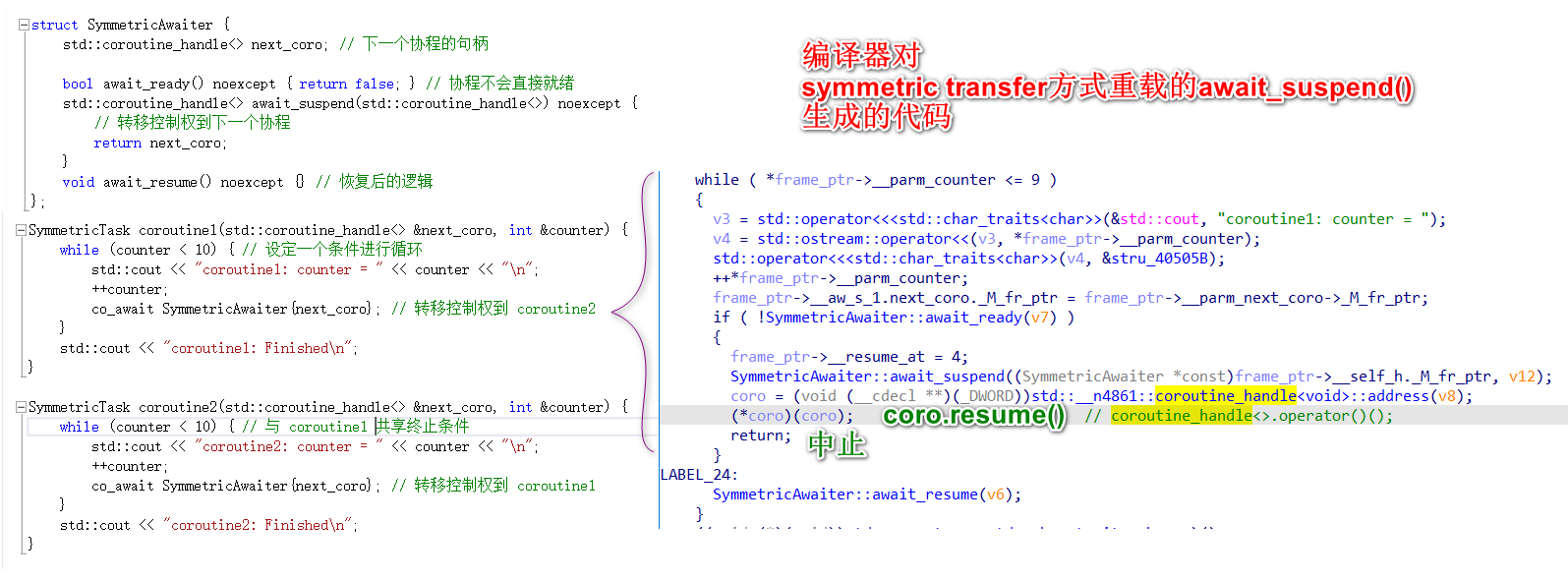 一对比来看,是不是很蛋痛。所以用std::coroutine进行协程切换时,必须依赖co_await让代码生成一个切换点,因此应该谨慎直接使用resume()。尽可能在一个co_await操作里面使用resume(),co_await操作的对象的一个awaiter,所以要尽可能在一个awaitable里面的await_suspend()函数中使用resume()。并且使用void awiat_suspend()重载,让原来的协程中止执行流,因为resume()结束后还会回到原来协程caller/resumer的代码。除此外,我们还可以通过symmetric_transfer方式来避免直接调用resume()。symmetric_transfer方式就是使用awiat_suspend()重载返回一个std::coroutine_handle。由编译器生成代码来调用resume()。所以上面的例子就变成下面的样子