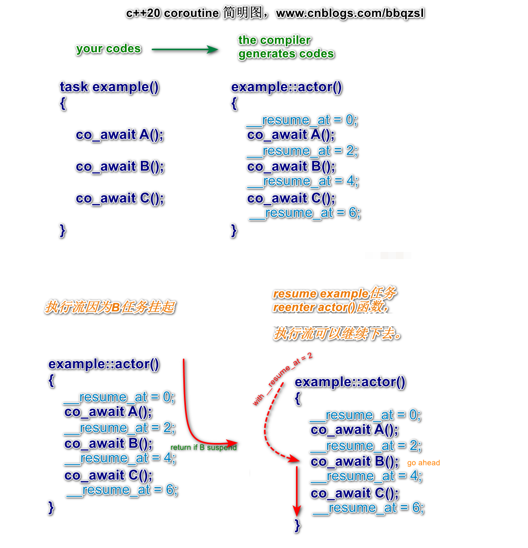 一个协程还依赖两个概念(接口),它们分别是Promise跟Awaitable,编译器使用它们编辑我们的协程代码。虽然没有明确地将它们定义成concept,但是可以等同于概念来看待。在上面的图可以看到编译器将协程函数的代码,用这两个概念的接口组装成一份新的函数代码。协程函数定义依赖Promise概念(接口),co_await关键字依赖Awaitable概念(接口)。