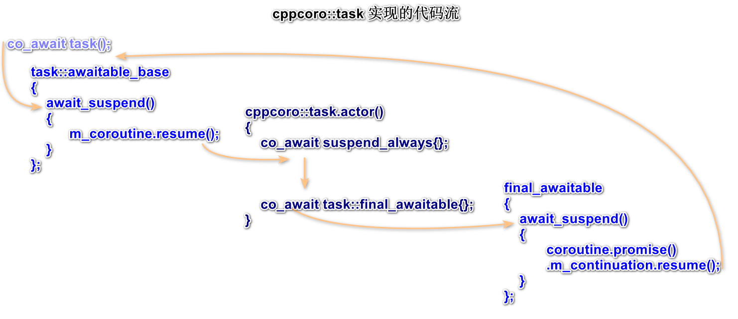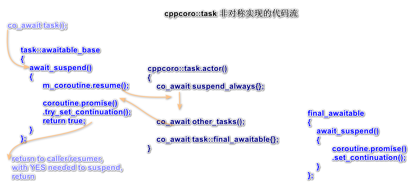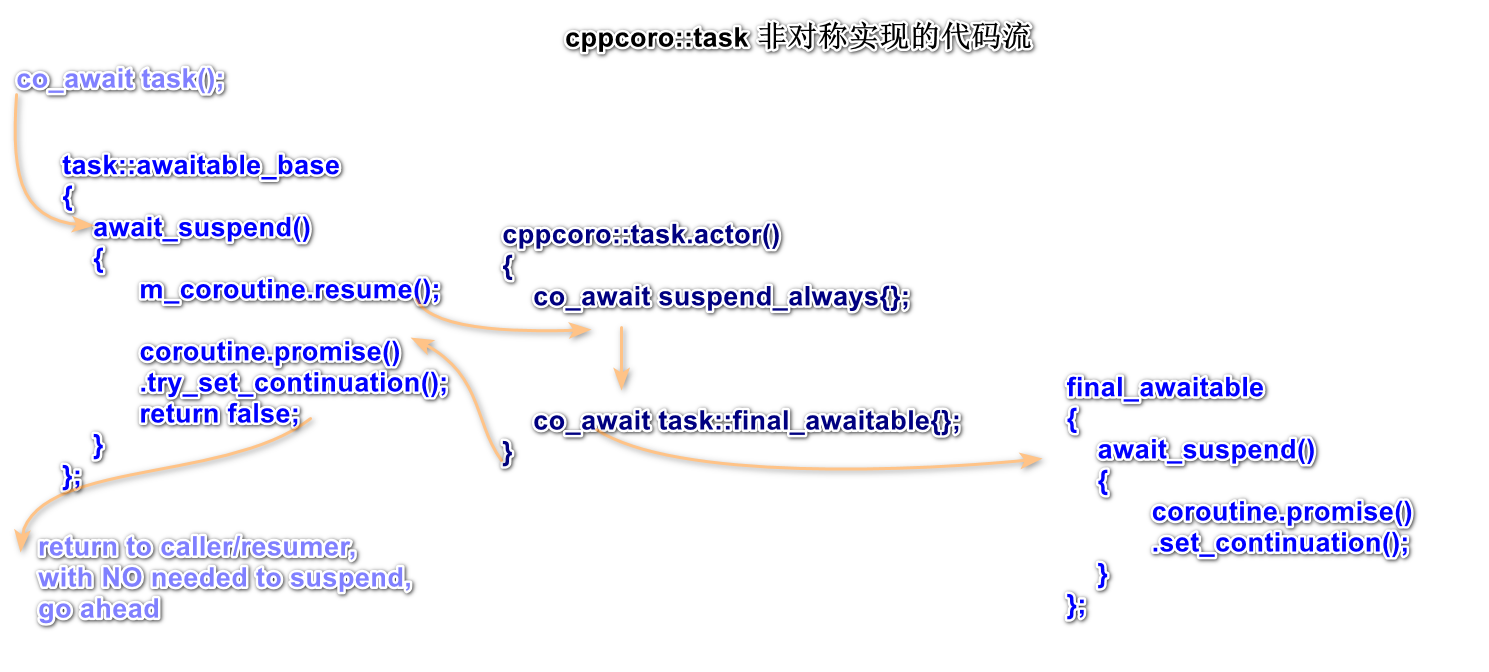 如果是对称方式的实现如上,非对称方式的实现,final_awaitable::await_suspend() return false,直接回到caller/resumer。