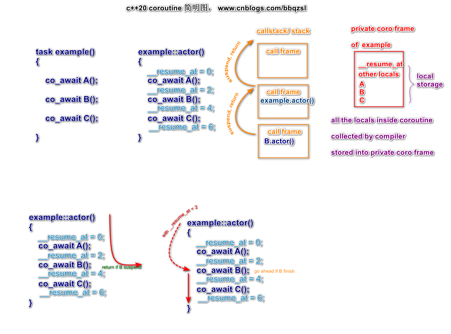 编译器会在每一处co_await调用的地方记下一个新状态。co_await都是一个待定的地方,此处有可能挂起。挂起就意味着协程切换。所以此处必须有一个状态来标记。不同于stackful协程那样使用现场保护进行代码跳转切换,stackless走的另一条路,使用状态机切换代码线路。当协程代码遇到需要挂起时,协程只需要保存当前状态机状态,立即退出函数返回,就可以中止当前代码流实现挂起。恢复协程,则再次重入协程函数,然后根据状态机保存的状态就可以直接切换回原来挂起的代码线路,继续执行。stackful协程是在完全模拟线程切换。线程不但可以通过代码主动切换,还要受中断被切换。被动切换会发生在代码任意位置,所以要保留大量现场信息。但是主动切换的位置,都是代码确定的,所以协程可以用状态机函数来实现切换。上面示例图,example协程,代码流执行到co_await B(),因为B awaiter需要挂起,而挂起example协程。example协程当前状态__resuem_at设置成2,直接退出函数中止执行流。当你恢复example协程时,重入函数,直接跳到__resume_at == 2的地方,这个地方会安排挂起源B的await_resume()方法接收结果,然后继续后面的代码流。这里必需要注意,example恢复时,不会去关心或检测B协程是否完成,所以由挂起源B来控制向协程发出恢复。