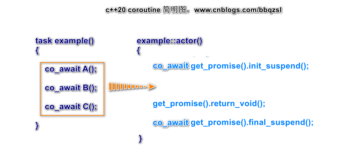 co_await关键字,使用Awaitable概念的三个接口函数来实现await操作。这时要注意,co_await expr语义,跟操作子operator co_await()函数是不同的。await操作是前者语法,后者语法是一个函数用来获取一个awaiter。co_await expr语义,期望expr是一个awaiter对象,这个对象满足Awaitable概念接口。如果expr不是一个awaiter对象,就会调用操作子operator co_await()函数向它索取一个awaiter对象。有了awaiter对象,然后展开代码对其实施await操作。await操作具体包含三个步,awaiter.await_ready()检测,awaiter.await_suspend()挂起,awaiter.await_resume()被恢复前夕。