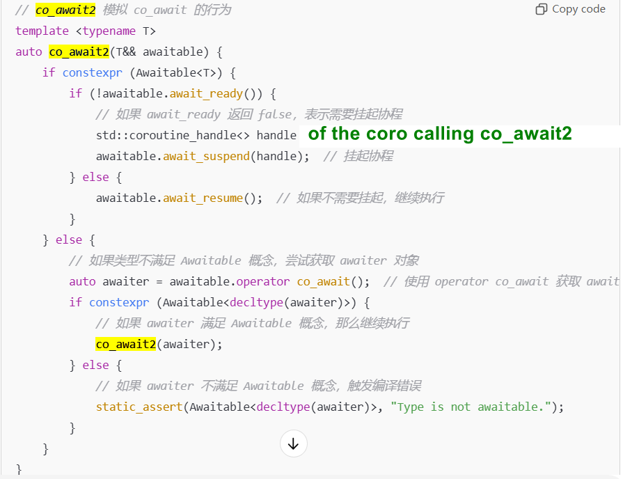 接下来看co_await是在做什么的。先来写一个co_await2函数来模拟编译器如何依赖Awaitable概念生成代码的。