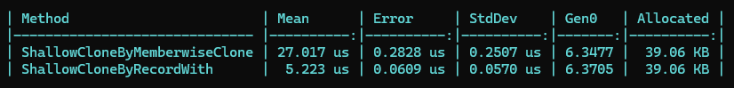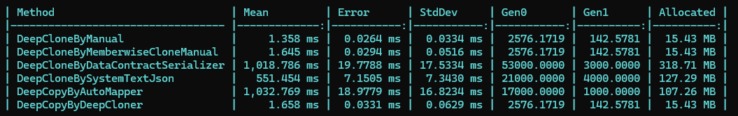 1 [MemoryDiagnoser] 2 public class BenchmarkTest 3 { 4 private readonly BenchmarkTestMode _data; 5 6 public BenchmarkTest() 7 { 8 _data = GetData(); 9 } 10 [Benchmark] 11 public void ShallowCloneByMemberwiseClone() 12 { 13 var original = _data; 14 for (int i = 0; i < 1000; i++) 15 { 16 var clone = original.ShallowClone(); 17 } 18 } 19 [Benchmark] 20 public void ShallowCloneByRecordWith() 21 { 22 var original = _data; 23 for (int i = 0; i < 1000; i++) 24 { 25 var clone = original with { }; 26 } 27 } 28 [Benchmark] 29 public void DeepCloneByManual() 30 { 31 var original = _data; 32 for (int i = 0; i < 1000; i++) 33 { 34 var benchmarkTestMode = new BenchmarkTestMode() 35 { 36 Angle = original.Angle, 37 Name = original.Name, 38 Points = original.Points.Select(i => new Point(i.X, i.Y)).ToList() 39 }; 40 } 41 } 42 [Benchmark] 43 public void DeepCloneByMemberwiseCloneManual() 44 { 45 var original = _data; 46 for (int i = 0; i < 1000; i++) 47 { 48 var clone = original.DeepClone(); 49 } 50 } 51 [Benchmark] 52 public void DeepCloneByDataContractSerializer() 53 { 54 var original = _data; 55 for (int i = 0; i < 1000; i++) 56 { 57 using var stream = new MemoryStream(); 58 var serializer = new DataContractSerializer(typeof(BenchmarkTestMode)); 59 serializer.WriteObject(stream, original); 60 stream.Position = 0; 61 var clone = (BenchmarkTestMode)serializer.ReadObject(stream); 62 } 63 } 64 [Benchmark] 65 public void DeepCloneBySystemTextJson() 66 { 67 var original = _data; 68 for (int i = 0; i < 1000; i++) 69 { 70 var data = System.Text.Json.JsonSerializer.Serialize(original); 71 var clone = System.Text.Json.JsonSerializer.Deserialize<BenchmarkTestMode>(data); 72 } 73 } 74 75 private BenchmarkTestMode GetData() 76 { 77 var original = new BenchmarkTestMode() { Name = "Test", Angle = 20 }; 78 original.Points = new List<Point>(); 79 for (int i = 0; i < 1000; i++) 80 { 81 original.Points.Add(new Point(i, 1000 - i)); 82 } 83 return original; 84 } 85 } 86 [DataContract] 87 public record class BenchmarkTestMode 88 { 89 [DataMember] 90 public string Name { get; set; } 91 [DataMember] 92 public int Angle { get; set; } 93 [DataMember] 94 public List<Point> Points { get; set; } 95 public BenchmarkTestMode ShallowClone() 96 { 97 return (BenchmarkTestMode)this.MemberwiseClone(); 98 } 99 public BenchmarkTestMode DeepClone() 100 { 101 var clone = (BenchmarkTestMode)this.MemberwiseClone(); 102 clone.Points = Points.Select(i => new Point(i.X, i.Y)).ToList(); 103 return clone; 104 } 105 }