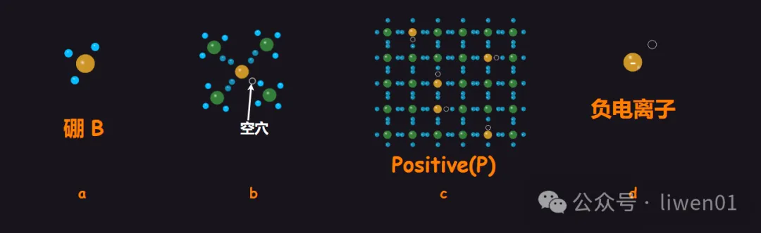 硼是第5号元素,它最外层只有3个电子。在本征硅中掺入少量的硼就得到Positive(P)型半导体。
