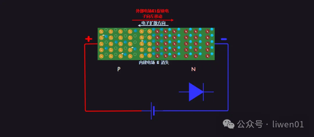 在外部电场E1的作用下,电子与P区的空穴进行复合,并朝电源正极移动,最终形成定向流动的电子(电流),需要注意的是电流方向与电子运动方向是相反的。