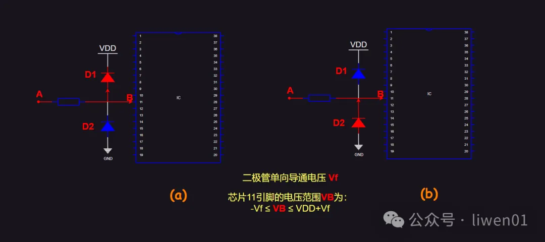 上图a中,如果输入端A点电压大于3.8V(3.3+0.5),D1 二极管会导通,如果输入端A点的电压继续增大,此时芯片11引脚B点的电压会保持在3.8V,避免过高的电压把芯片引脚烧坏。