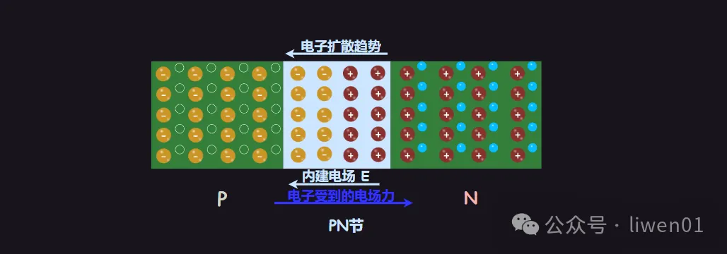 PN 结的 P 区一侧带负电,N 区一侧带正电,于是 PN 结便产生了一个内电场E,内电场的方向从 N 区指向 P 区。内电场对扩散运动起到阻碍作用,电子和空穴的扩散运动随着内电场的加强而逐步减弱,直至平衡稳定。