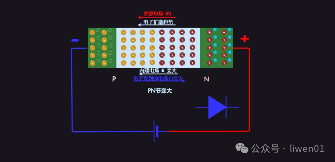 这时外加电场E1与内电场E方向相同,使内电场的作用增强,PN结变大,