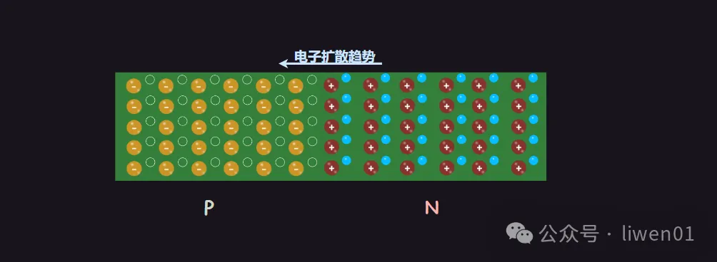 由于存在浓度差,所以P区中的空穴会向 N 区扩散,并在 N 区被电子复合;而 N 区中的电子也会向 P 区扩散,并在 P 区被空穴复合。