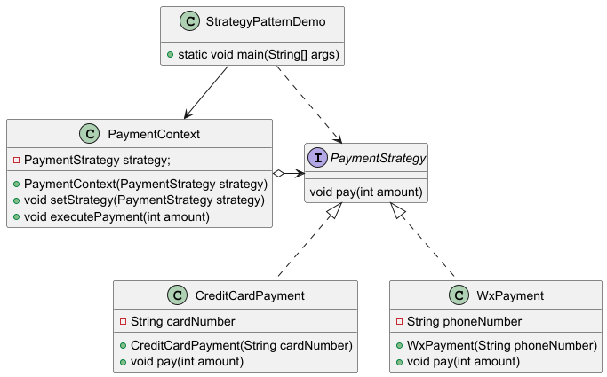PaymentContext context = new PaymentContext(new CreditCardPayment("1234-5678-9012-3456"));